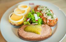- – Happenteller mit drei Happen: Mett, Leberwurst und FRÜH’s Holländer